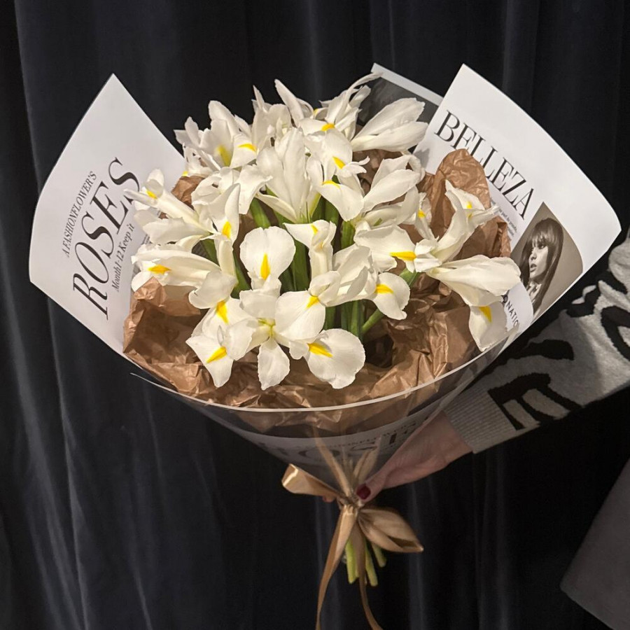 На фото букет из 11 белых ирисов. В составе: ирис 11 шт, дизайнерская упаковка 1 шт, атласная лента 1 шт, . Все цветы свежие и ароматные, букет красиво оформлен и отлично подходит для подарка. Доступна доставка цветов или самовывоз.