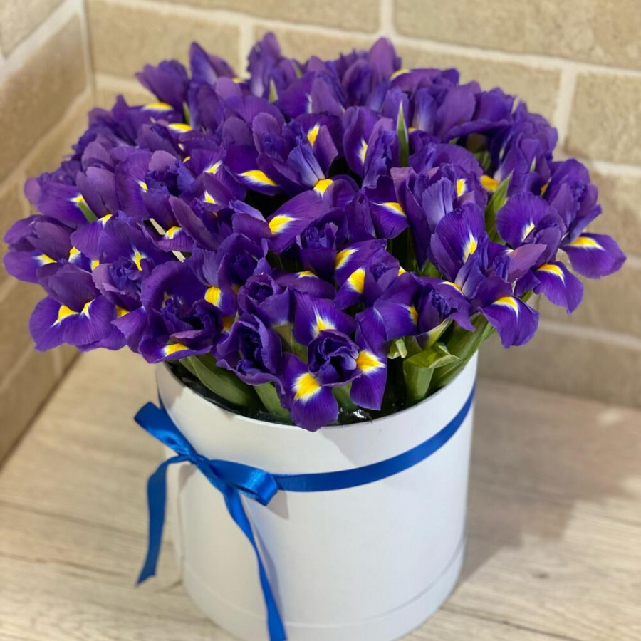 На фото 45 фиолетовых ирисов в шляпной коробке. В составе: ирис 45 шт, оазис флористический 1 шт, шляпная коробка (m) 1 шт, атласная лента 1 шт, . Все цветы свежие и ароматные, букет красиво оформлен и отлично подходит для подарка. Доступна доставка цветов или самовывоз.