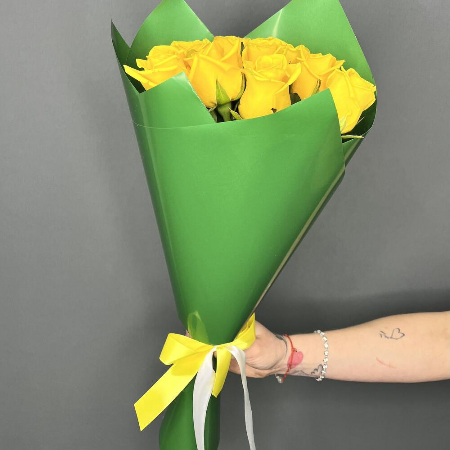 На фото букет из 9 желтых роз. В составе: роза 9 шт, дизайнерская упаковка 1 шт, атласная лента 1 шт, . Все цветы свежие и ароматные, букет красиво оформлен и отлично подходит для подарка. Доступна доставка цветов или самовывоз.