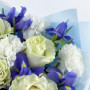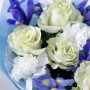 Букет из белых гвоздик, синих ирисов и белых роз в Реже