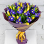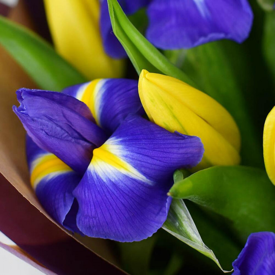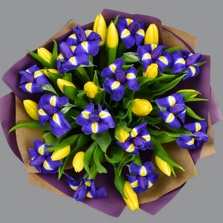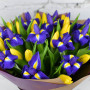 Букет из синих ирисов и желтых тюльпанов в Реже