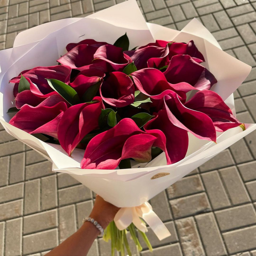 На фото букет из 25 красных калл. В составе: калла 25 шт, крафт-бумага 1 шт, вероника 1 шт, . Все цветы свежие и ароматные, букет красиво оформлен и отлично подходит для подарка. Доступна доставка цветов или самовывоз.