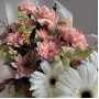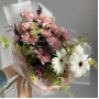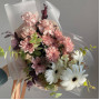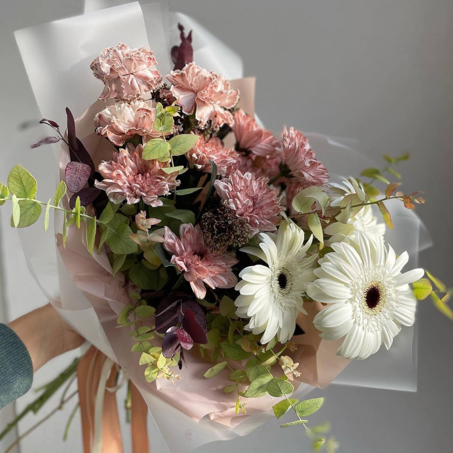 На фото букет из кустовой хризантемы и гвоздики. В составе: хризантема кустовая 4 шт, гвоздика 3 шт, гербера 3 шт, скиммия 1 шт, эвкалипт 1 шт, крафт-бумага 1 шт, . Все цветы свежие и ароматные, букет красиво оформлен и отлично подходит для подарка. Доступна доставка цветов или самовывоз.