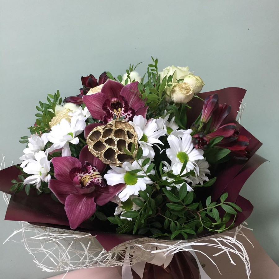 На фото букет из лотоса и орхидей. В составе: лотос 1 шт, хризантема кустовая 2 шт, орхидея 2 шт, альстромерия 2 шт, кустовая роза 2 шт, писташ 2 шт, крафт-бумага 1 шт, атласная лента 1 шт, . Все цветы свежие и ароматные, букет красиво оформлен и отлично подходит для подарка. Доступна доставка цветов или самовывоз.