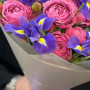 Букет из розовых пионовидных роз и синих ирисов в Реже