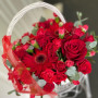 На фото корзина из роз и гербер. В составе: гербера 2 шт, роза 4 шт, кустовая роза 5 шт, эвкалипт 5 шт, корзина (m) 1 шт, атласная лента 1 шт, . Все цветы свежие и ароматные, букет красиво оформлен и отлично подходит для подарка. Доступна доставка цветов или самовывоз.