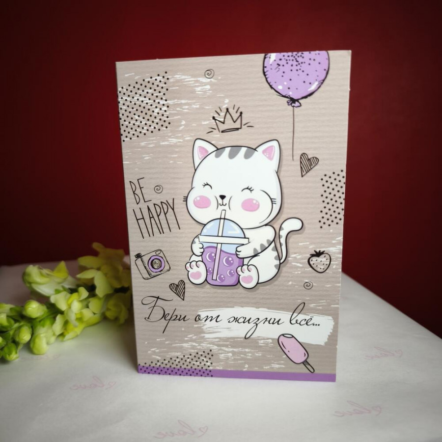 На фото открытка «бери от жизни все». В составе: . Все цветы свежие и ароматные, букет красиво оформлен и отлично подходит для подарка. Доступна доставка цветов или самовывоз.