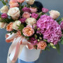 На фото розовая гортензия с розами в коробке. В составе: гортензия 1 шт, кустовая роза 4 шт, кустовая пионовидная роза 6 шт, роза 5 шт, шляпная коробка (m) 1 шт, атласная лента 1 шт, . Все цветы свежие и ароматные, букет красиво оформлен и отлично подходит для подарка. Доступна доставка цветов или самовывоз.